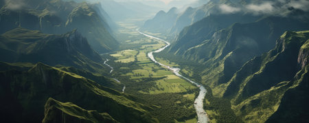 Mountain landscape with river. Panoramic view from the top of the mountain.