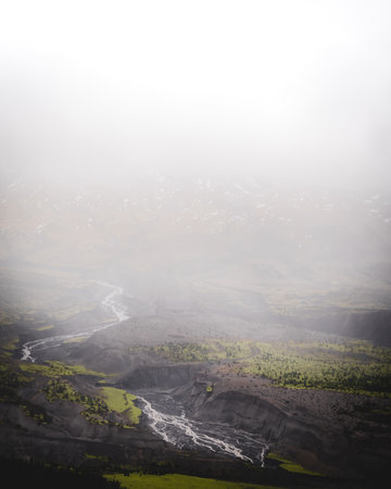 A vertical shot of the Mount Saint Helens in Washington State enveloped in fog
