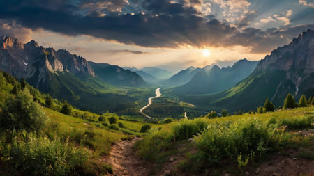 A breathtaking landscape showcases towering mountains at sunset, with a golden light illuminating a grass field in the foreground, capturing natures beauty and tranquility.