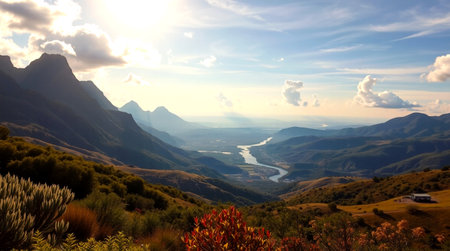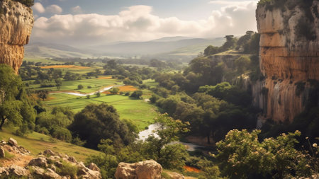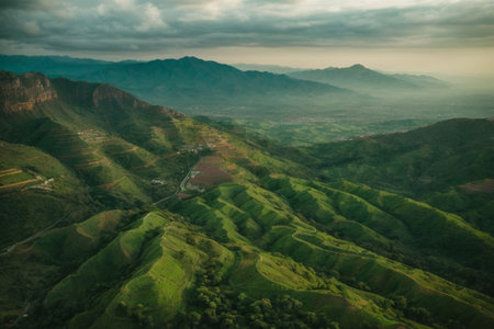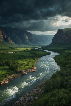 A breathtaking vista of a verdant valley, characterized by undulating green hills, dense foliage, and a winding river, under a dramatic sky.
