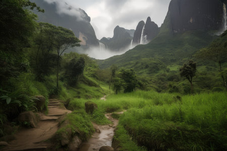 off-the-beaten-path destination where the natural elements are on full display, with majestic waterfalls and rolling mountains in the background, created with generative ai