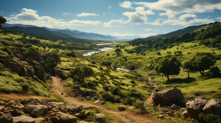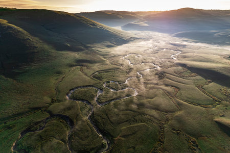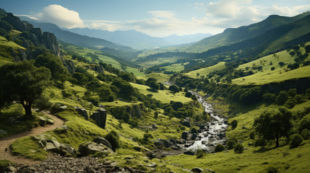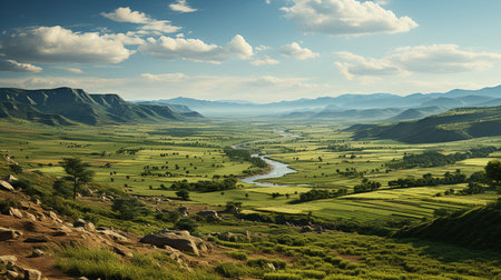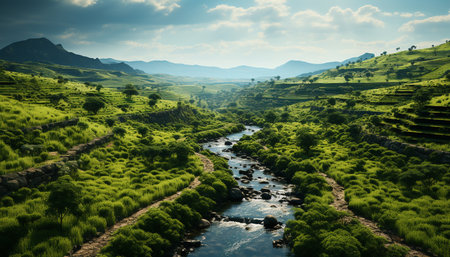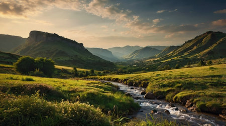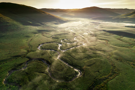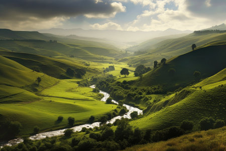 A gentle river meanders through vibrant green hills, creating beautiful curves as it travels across a tranquil valley. Sunlight enhances the rich colors, bringing nature to life.