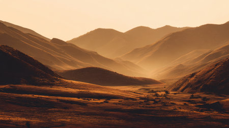 Majestic mountains bathed in warm golden light create serene landscape. rolling hills and valleys evoke sense of tranquility and natural beauty, perfect for outdoor enthusiasts