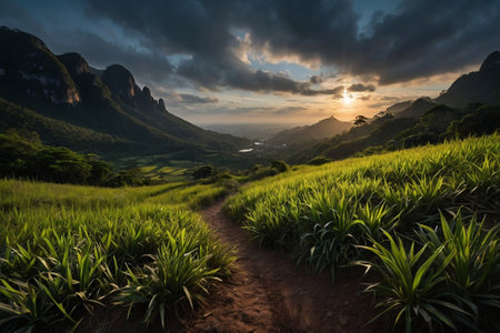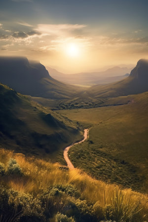 A breathtaking view of a winding mountain road surrounded by vibrant greenery, illuminated by a stunning golden sunset. This serene landscape captures the essence of nature's beauty.