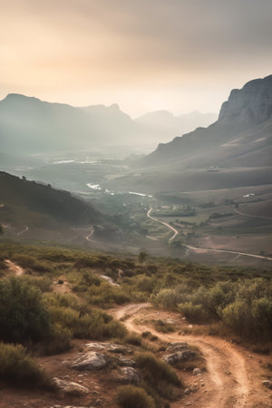 Generative AI : Aerial view of hikers looking over De Pakhuys valley at sunrise in Cederberg Western Cape South Africa