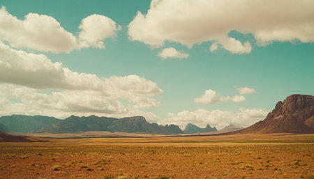 Vast desert landscape showcases rolling hills and mountains under clear blue sky. warm tones of earth contrast beautifully with distant peaks, creating serene and tranquil atmosphere