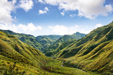 Beautiful mountain landscape with green grass and blue sky in the morning