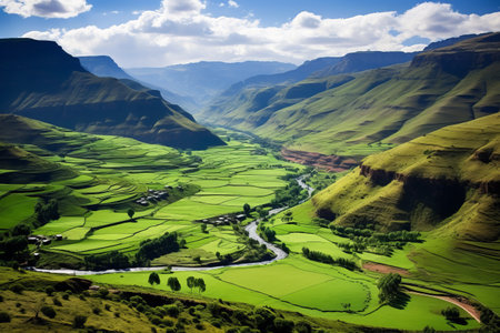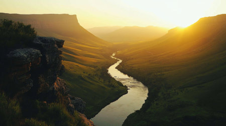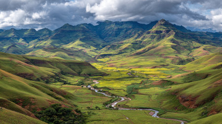 Explore a breathtaking view of lush green hills and a winding river nestled in the Drakensberg Mountains. The dramatic sky adds depth and beauty.