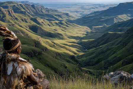 A warrior clad in traditional attire sits atop a rocky outcrop, staring across a sprawling green valley illuminated by the warm light of late afternoon.