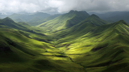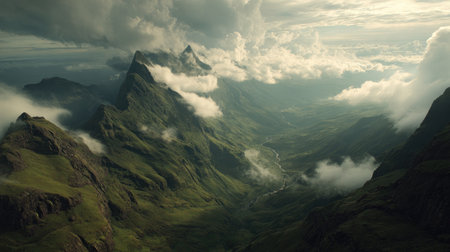 A stunning aerial view of a dramatic mountain landscape, featuring lush green valleys and swirling clouds, capturing the essence of untouched nature's splendor.