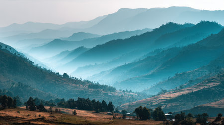 Serene view of a misty mountain range showcasing layers of blue hues and rolling hills. The soft light highlights the natural beauty and tranquility of the landscape.