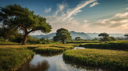 Panoramic view of a small river in the middle of a rice field with trees and mountains in the background