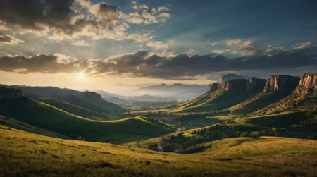 Rolling green hills stretch across the landscape, with gentle mountains rising in the distance under soft morning light, showing natures serenity.