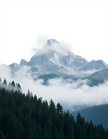 Photo depicting beautiful a foggy mystic mountains. Fog clouds at the pine tree mystical woods, morning. Europe, mysterious alps landscape.