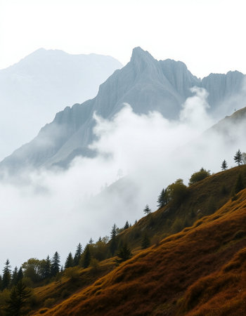 Mountain landscape with fog and clouds in the Alps, Austria.