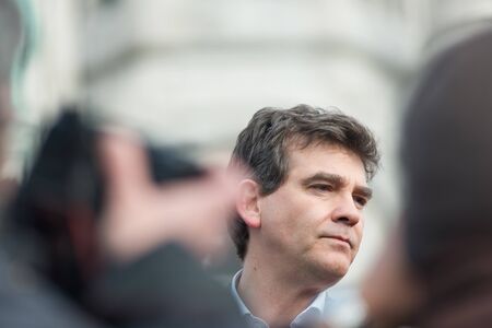 French Minister for Industrial Renewal Arnaud Montebourg supports the made in France and talks to the employees of the company Blanc de Vosges at Montmartre.Paris, FRANCE-06/04/2013