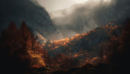 Autumn mist envelops vibrant orange and green trees in a mountain valley during a tranquil morning