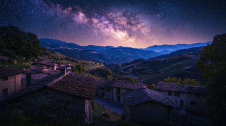 Under a clear sky, a picturesque village nestled in the mountains is illuminated by the vibrant colors of the Milky Way, creating a mesmerizing night view.