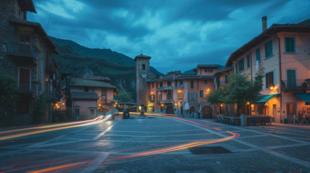A small village square transforms into a lively scene as cars with their headlights on pass by highlighting the charming architecture of the surrounding buildings