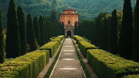 A stunning pathway flanked by tall trees leads to a historic building, creating a picturesque scene. This tranquil setting is ideal for nature enthusiasts and travelers.