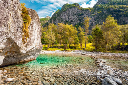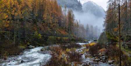 Autumn colors in the forests of Valtellina in Italy. Reflection of autumn foliage in the forests of the Val Masino - Val di Mello mountains in Lombardy in Italy