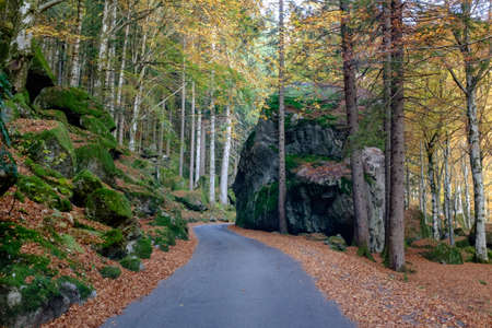 A scenic winding road weaves through a dense forest, featuring vibrant red and green foliage. The landscape showcases textured rock formations and a cloudy sky. This image is suitable for various commercial applications, including travel brochures and editorial content related to nature.