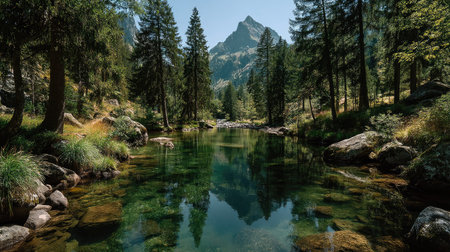 Calm waters reflect towering mountains and lush pine forests under a clear blue sky. Soft sunlight illuminates the vibrant scenery, creating a peaceful natural environment.