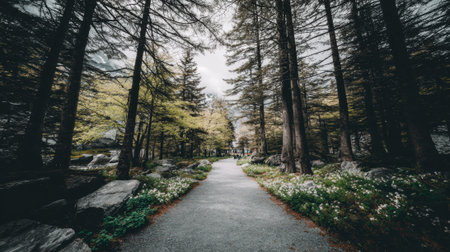 Paved walkway winding through tall trees and lush undergrowth in a peaceful forest setting
