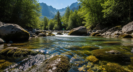 The shallow waters and rocky bottom of Verzasca River, surrounded with tall conifer trees, Valle Verzasca, Switzerland