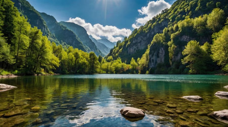 Mountain lake in the middle of the forest. Beautiful landscape.