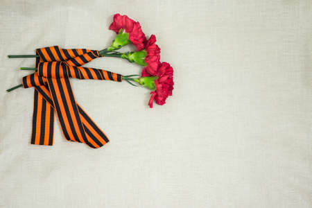Military cap with red flowers, Saint George ribbon and orders of Great Patriotic war on white background. illustrative editorial.
