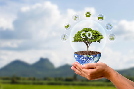 Net zero greenhouse gas emissions reduction with carbon credit concept. Reduce carbon dioxide e.g. renewable energy production improve the efficiency of transportation reduce environmental pollution.