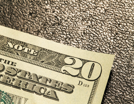 Big amount of old twenty dollar bills on golden background. Money earnings, payday or tax paying period concept