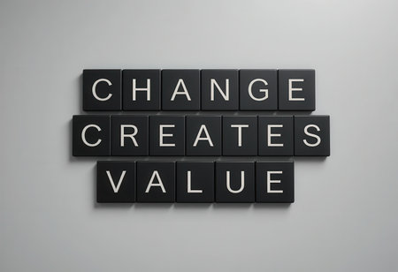 A minimalist arrangement of tiles spelling Change Creates Value on a gray background, symbolizing inspiration and growth in professional development.