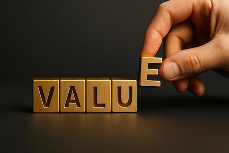A hand carefully places the final golden letter E to spell out VALUE with elegant metallic blocks on a dark, reflective surface, symbolizing importance.