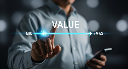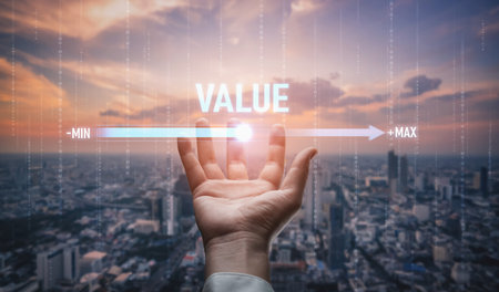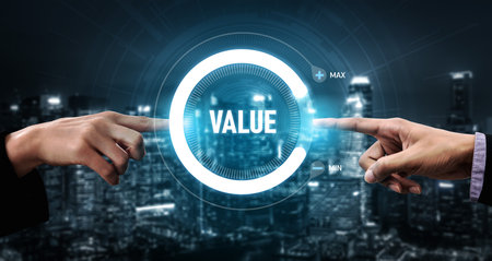 Value measurement and adjustment concept showing value, performance, and optimization level with focus on data analytics, calibration, and improvement