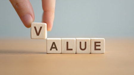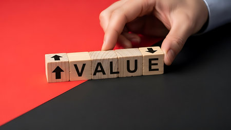 An image of a hand arranging wooden blocks to spell out the word 'VALUE'. The blocks have arrows pointing upwards, suggesting growth or increase in value. The background is a gradient of red and black, adding a dramatic effect.