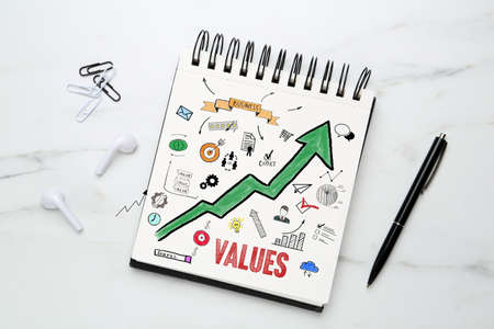 Concept of core values. Notebook with different images and marker on white wooden table, flat lay