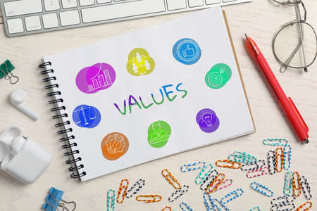 Concept of core values. Notebook with different images and stationery on white wooden table, flat lay