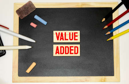 ADDED VALUE. Chalkboard with written message and beautiful beach background.