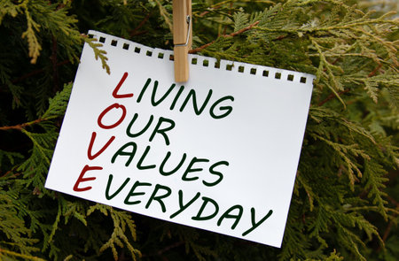 LIVING OUR VALUES EVERYDAY - words on white paper with clothespin on a green background of branches. info concept