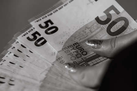 Persons hand counting cash money paper currency payment. Financial operations with cash money, easy and dirty money. Financial Crisis Eu Bill. Concept - Finance Business Investment Success