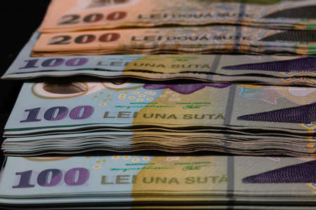 Detail of LEI banknotes. Staks of Romanian LEI banknotes. World money concept, inflation and economy concept