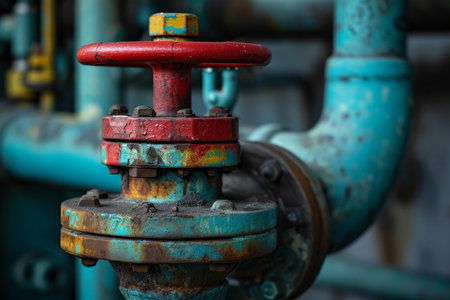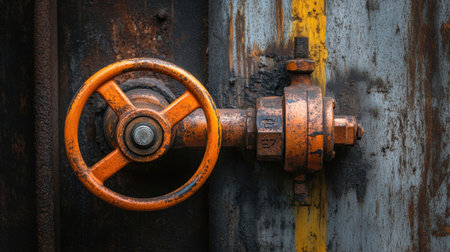Close-up image of a rusty industrial valve on aged metal pipes, showcasing unique textures and vibrant colors. Perfect for themes of industry and machinery.