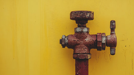 This image showcases a rusty valve against a vibrant yellow backdrop, highlighting industrial elements with a unique contrast and artistic flair.
