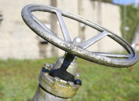 Large valve on the water pipe on a nature blurred background, selective focus