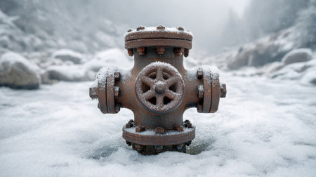 A close-up view of a vintage iron valve covered in snow, set in a frosty landscape. The soft fog adds a serene atmosphere, capturing the beauty of winter.