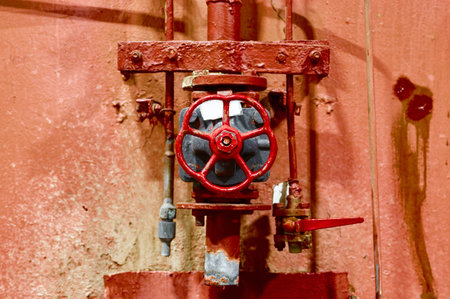 This detailed image showcases industrial valves featuring red handwheels, exemplifying rugged machinery in a factory setting with visible wear.