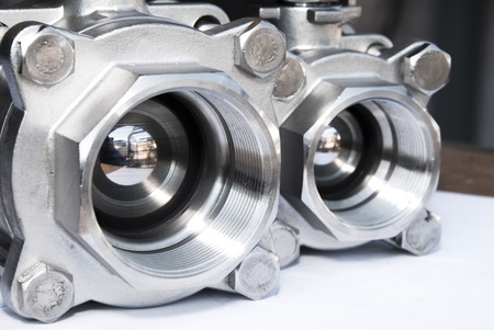 Close-up of industrial pair of valves with focus on foreground ventil with copy space.