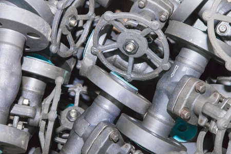 Gas equipment close-up. Many valves on gas pipe. Butterfly valves are attached with chain. Gasification equipment. Fragment of boiler equipment. Butterfly valves on pipes of enterprise